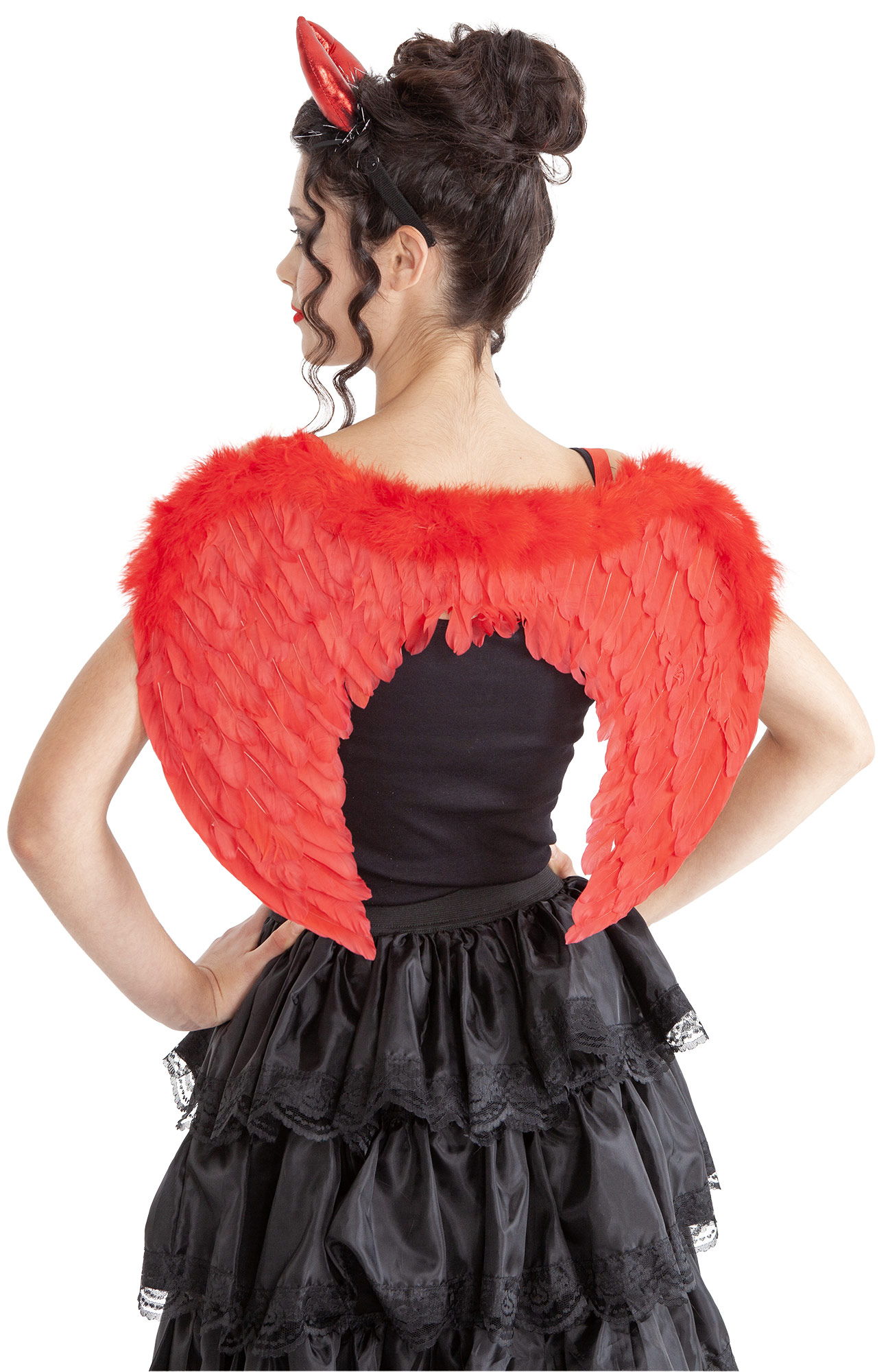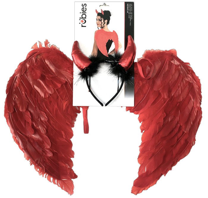 Une paire d’ailes recouvertes de plumes rouges , à enfiler (comme un sac)Un serre tête de démon noir
