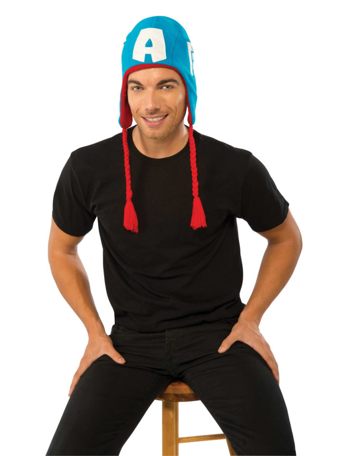 Un bonnet type bonnet péruvien / Chapka bleu et rouge avec logo A de Captain America sur le devant, cache-oreilles et 2 tresses sur les côtés.