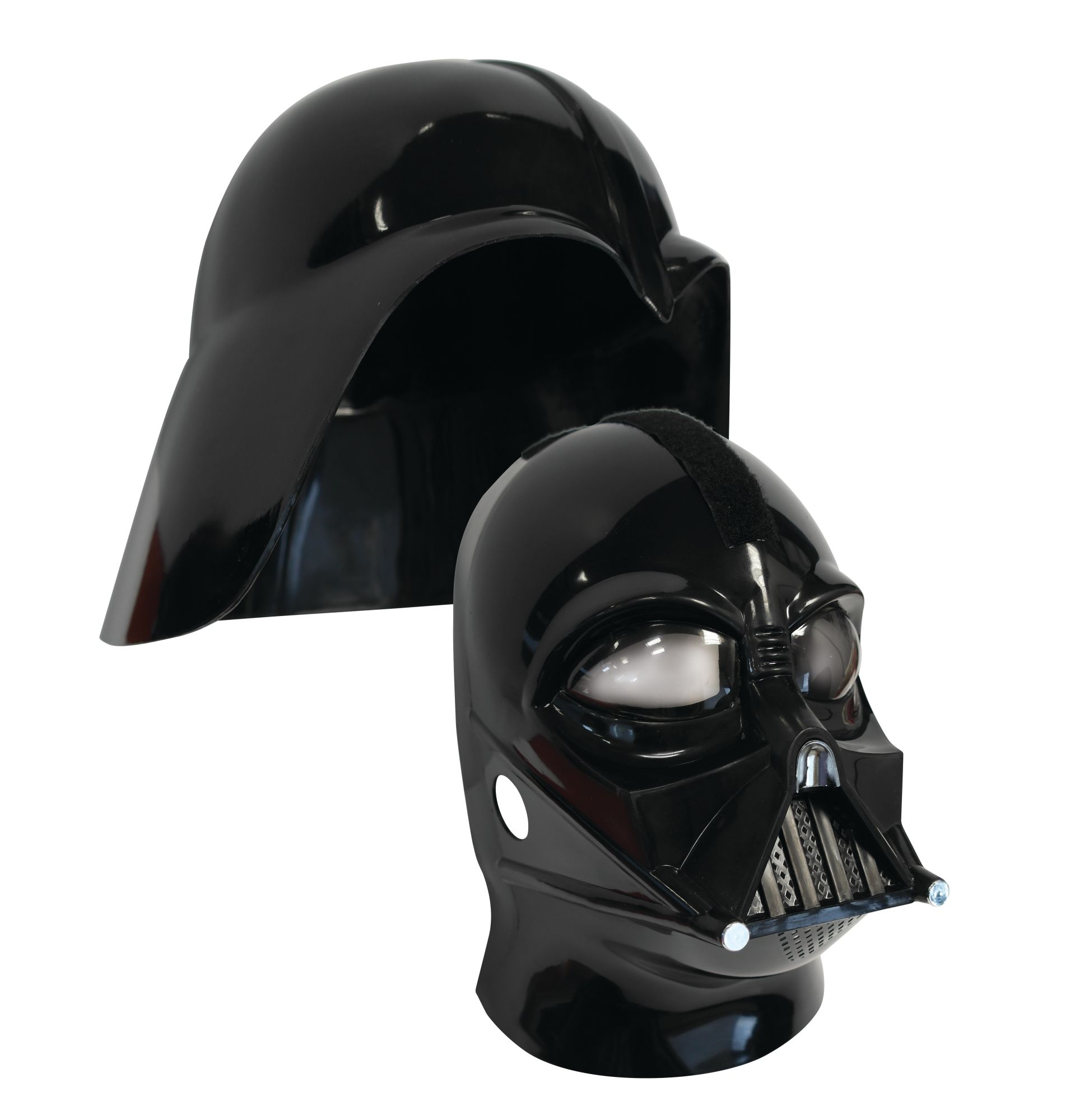 Un casque intégral en PVC à l’effigie de Dark Vador.Le produit, reproduction en taille réelle du casque du célèbre méchant de la saga Star Wars, se compose de deux pièces avec attaches en velcroProduit présenté dans une boîte ouverte