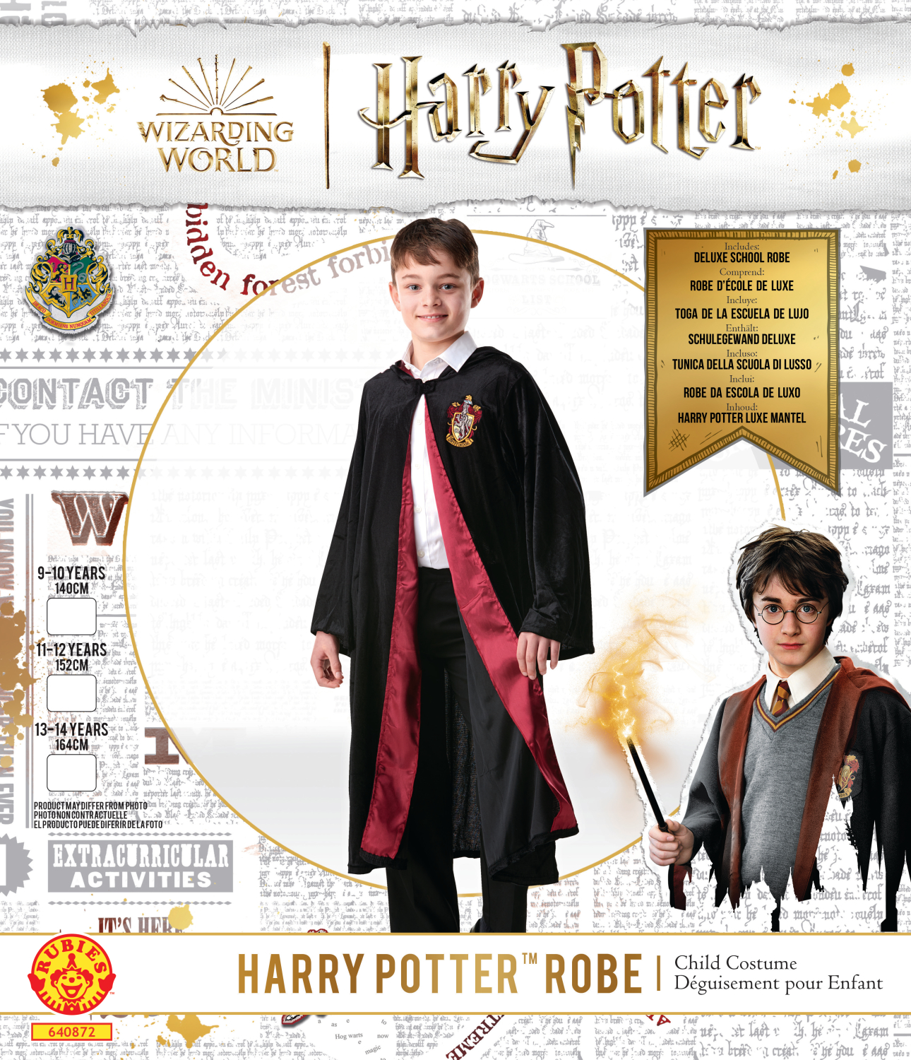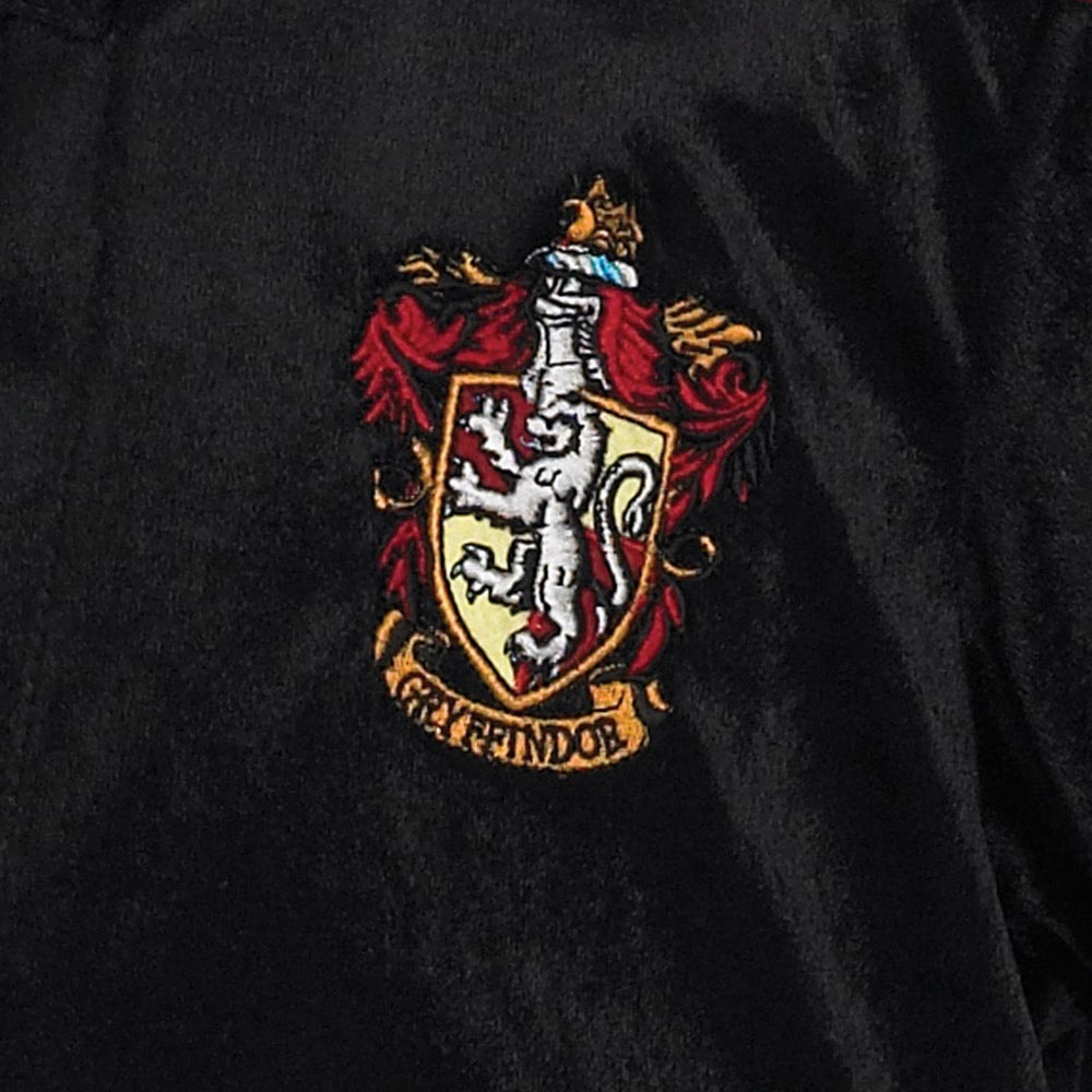Une robe effet velours noir doublée d’une matière satinée rouge au niveau des revers et de la capuche intégrée. Le blason de la maison Gryffondor est brodé sur la robe.