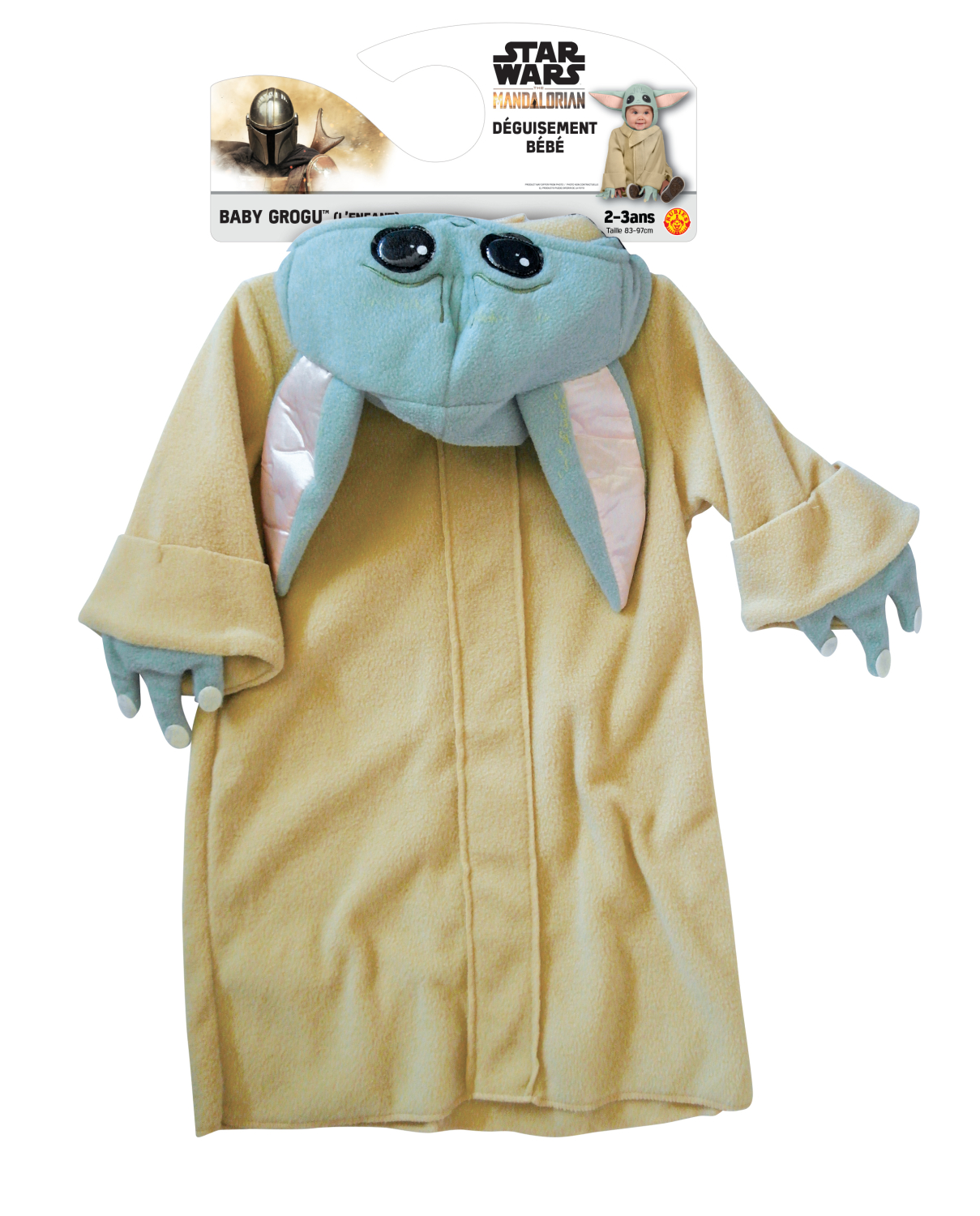 Un manteau intégral long en tissu polaire beige avec col montant et attaches velcro.Mains en mousse imprimée intégrées aux manches.Une cagoule en tissu mousse à l’effigie de Baby Yoda avec oreilles rembourrées.