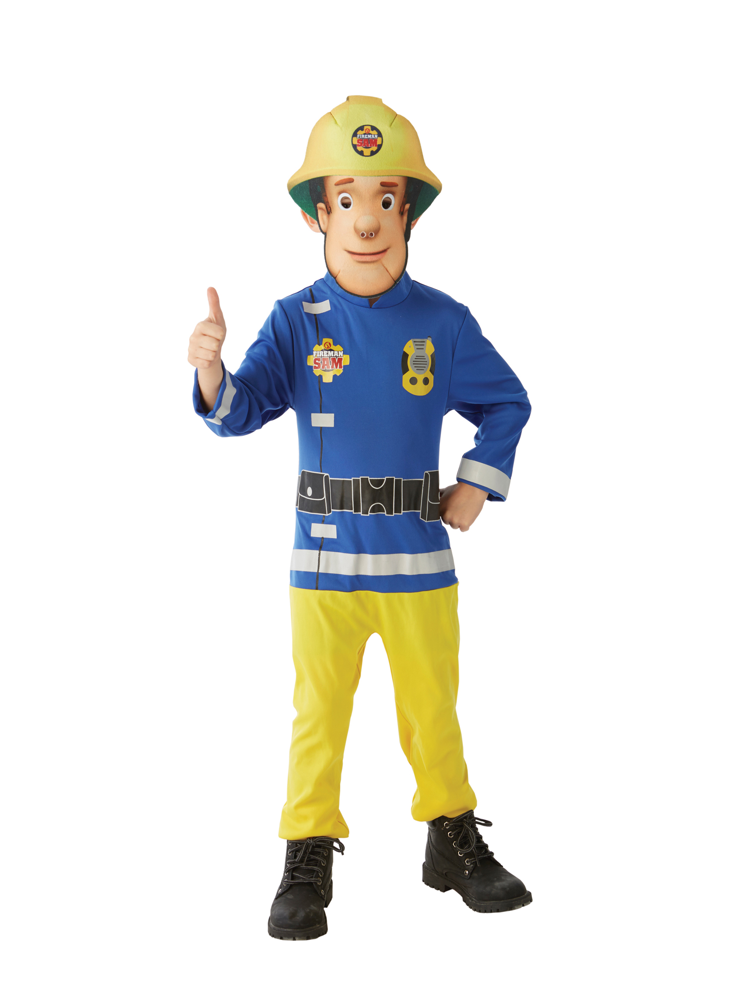 Une combinaison en tissu jersey bleue et jaune imprimée imitation « uniforme de Sam le Pompier ».Un masque imprimée en feutrine assorti avec attache élastique à l’arrière.