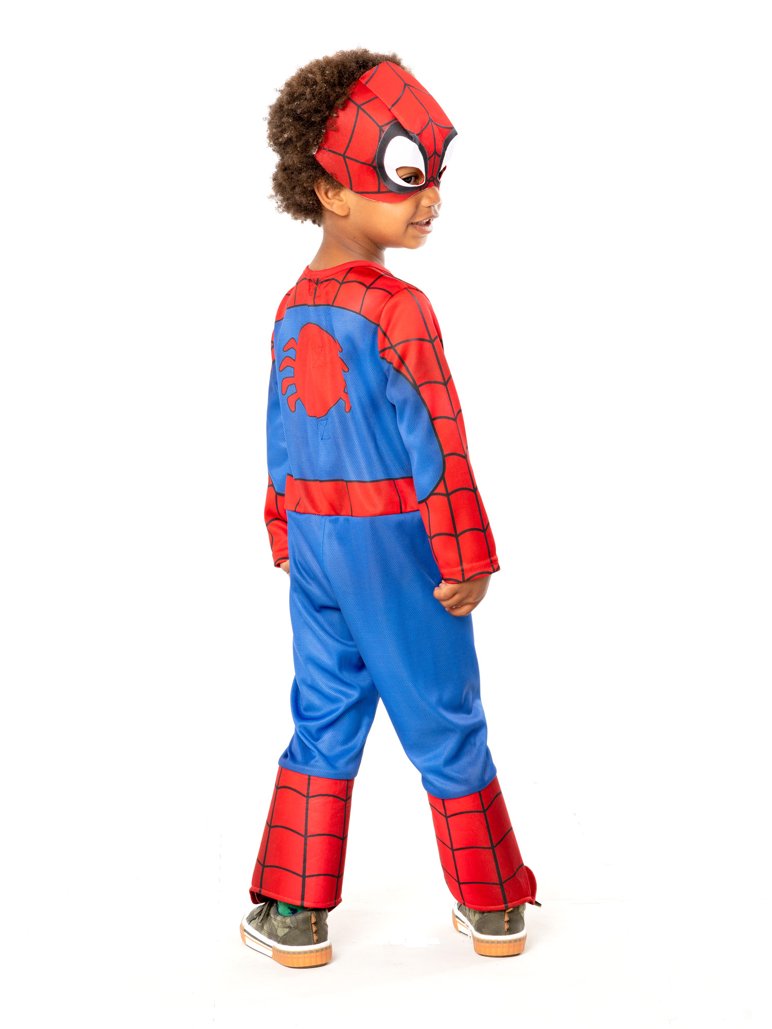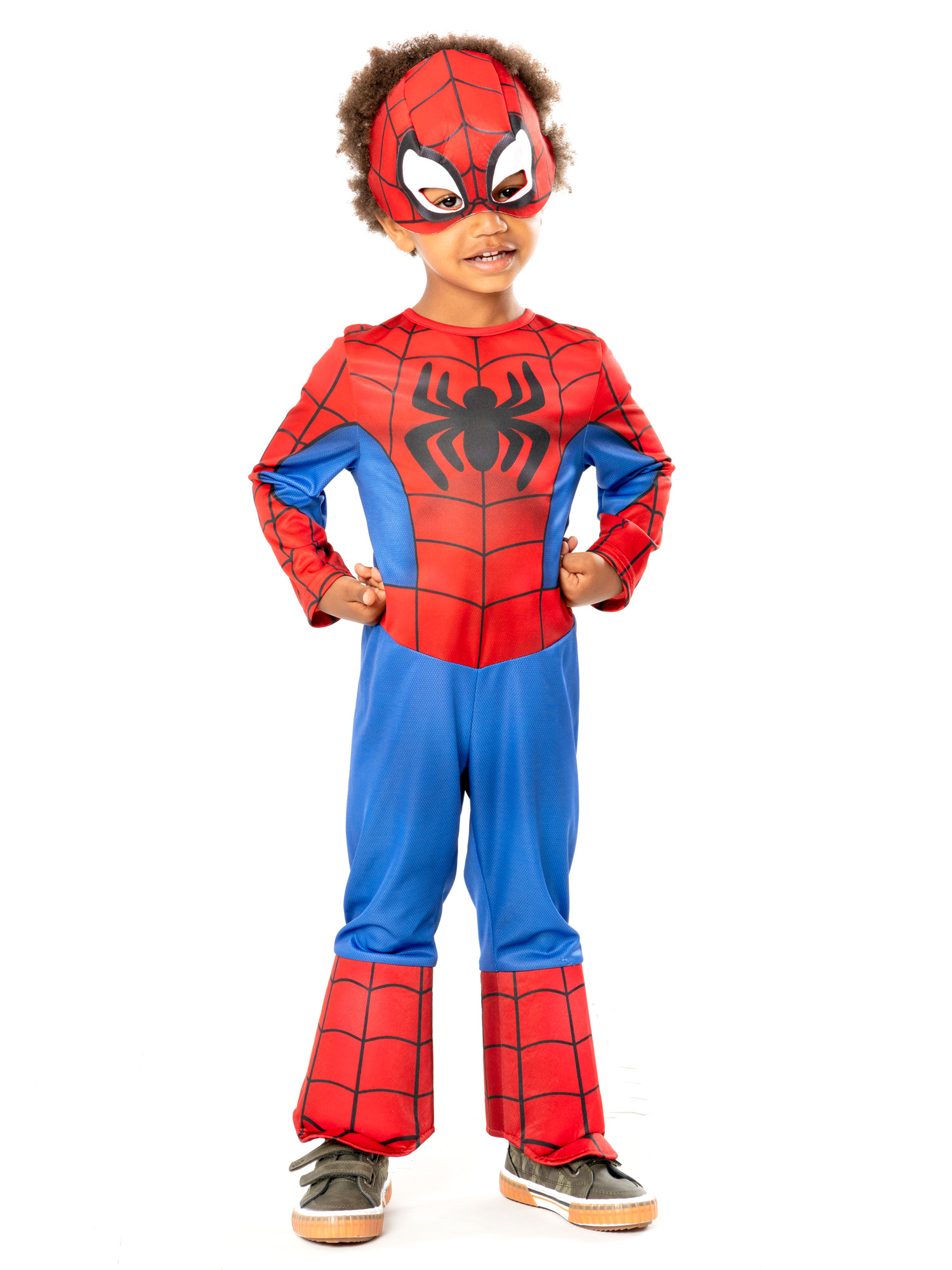 Une combinaison en jersey imprimée rouge et bleue avec logo Spider-Man sur le buste.Un masque en jersey imprimé assorti.