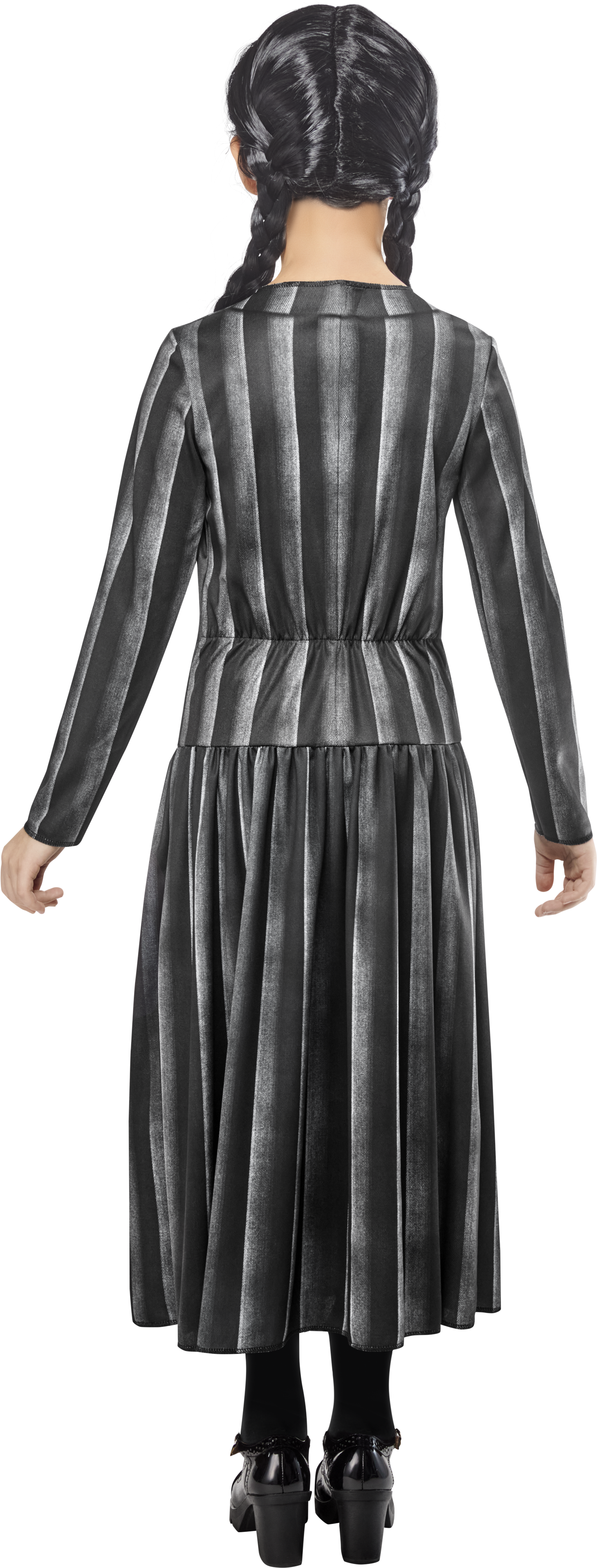 Une robe longue en jersey imprimé type uniforme gris et noir avec veste et blason Nevermore Academy imprimés sur le top.