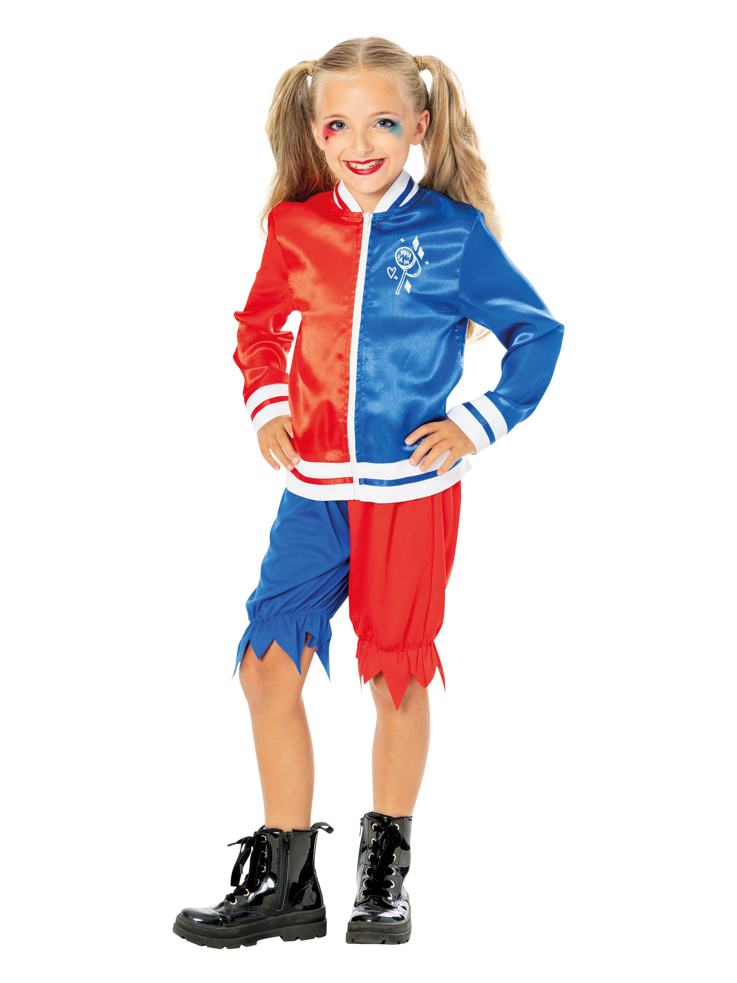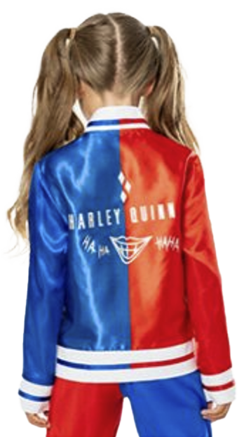 Une veste à manches longues en tissu recyclé imprimé bleue et rouge avec inscriptions dans le dos.
