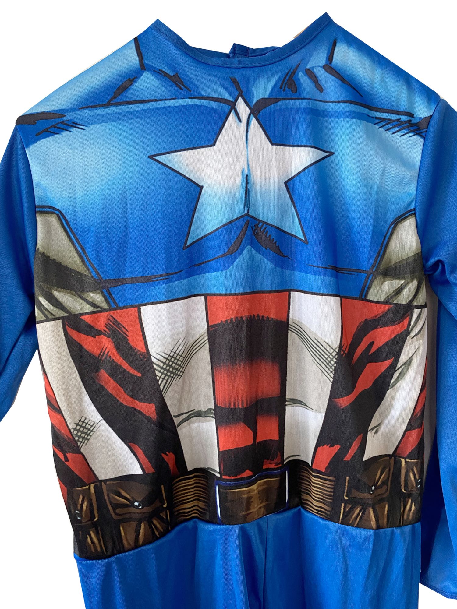 Une combinaison à manches longues en tissu jersey imprimé sur le top.Une cagoule en mousse assortie à l’effigie de Captain America avec ouvertures pour les yeux.
