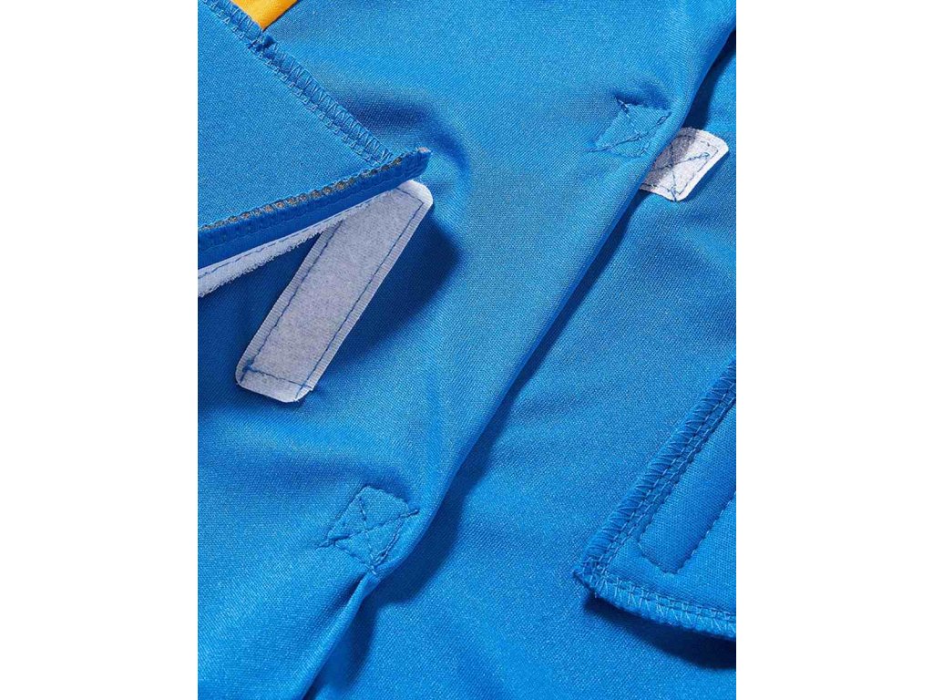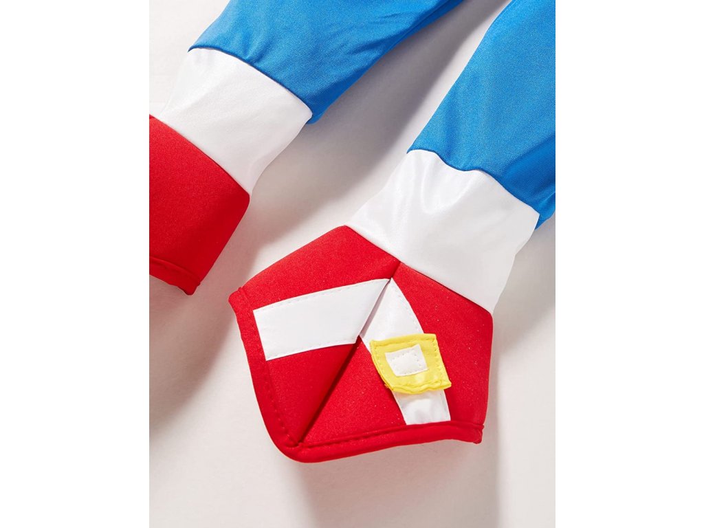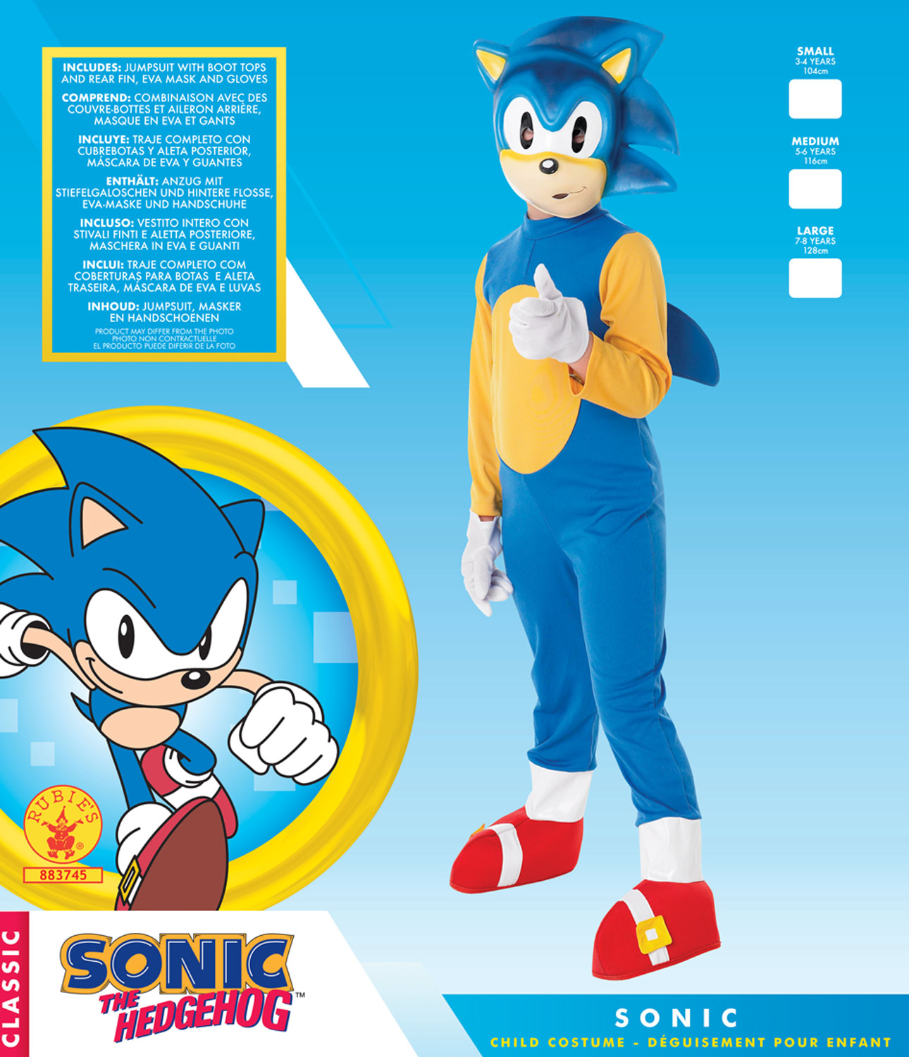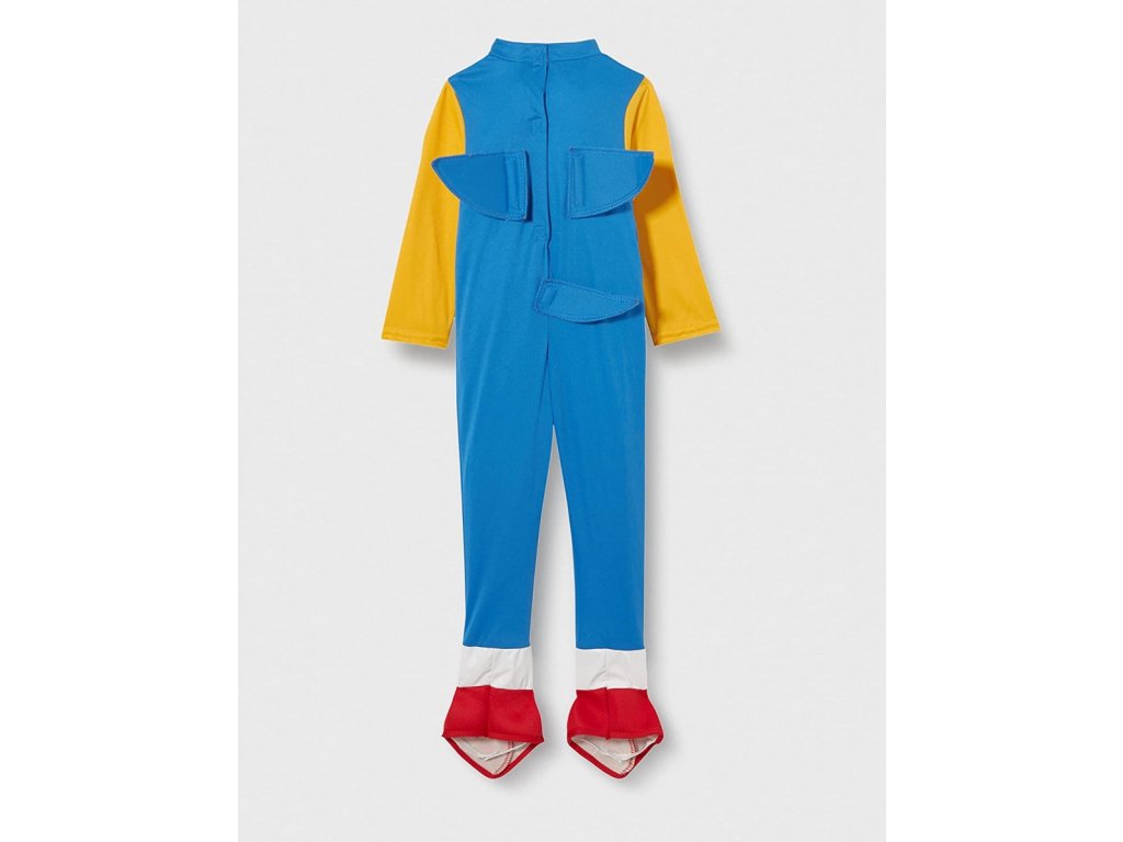 Une combinaison en jersey jaune et bleue.Couvre-bottesUn masque de Sonic en PVC avec attache élastiqueUne paire de gants blancs