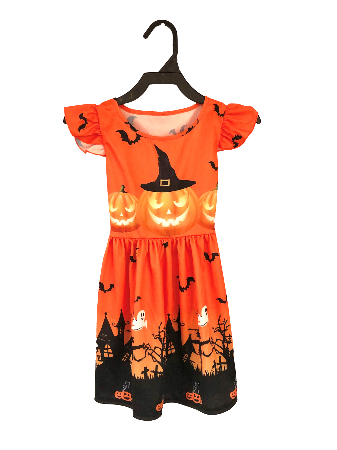 Une robe imprimée Halloween orange avec différents motifs : citrouilles, fantômes, chauve-souris…Un petit sac à bonbons en tissus