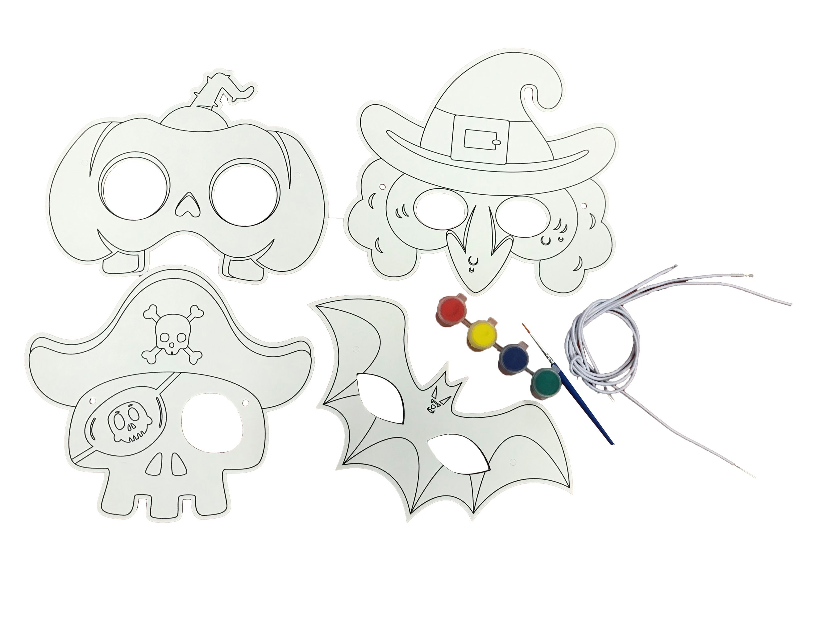 4 masques à colorier soi-même pour Halloween 4 élastiques 4 stickers de décoration1 masque Citrouille1 masque Chauve souris1 masque Sorcière1 masque Diable