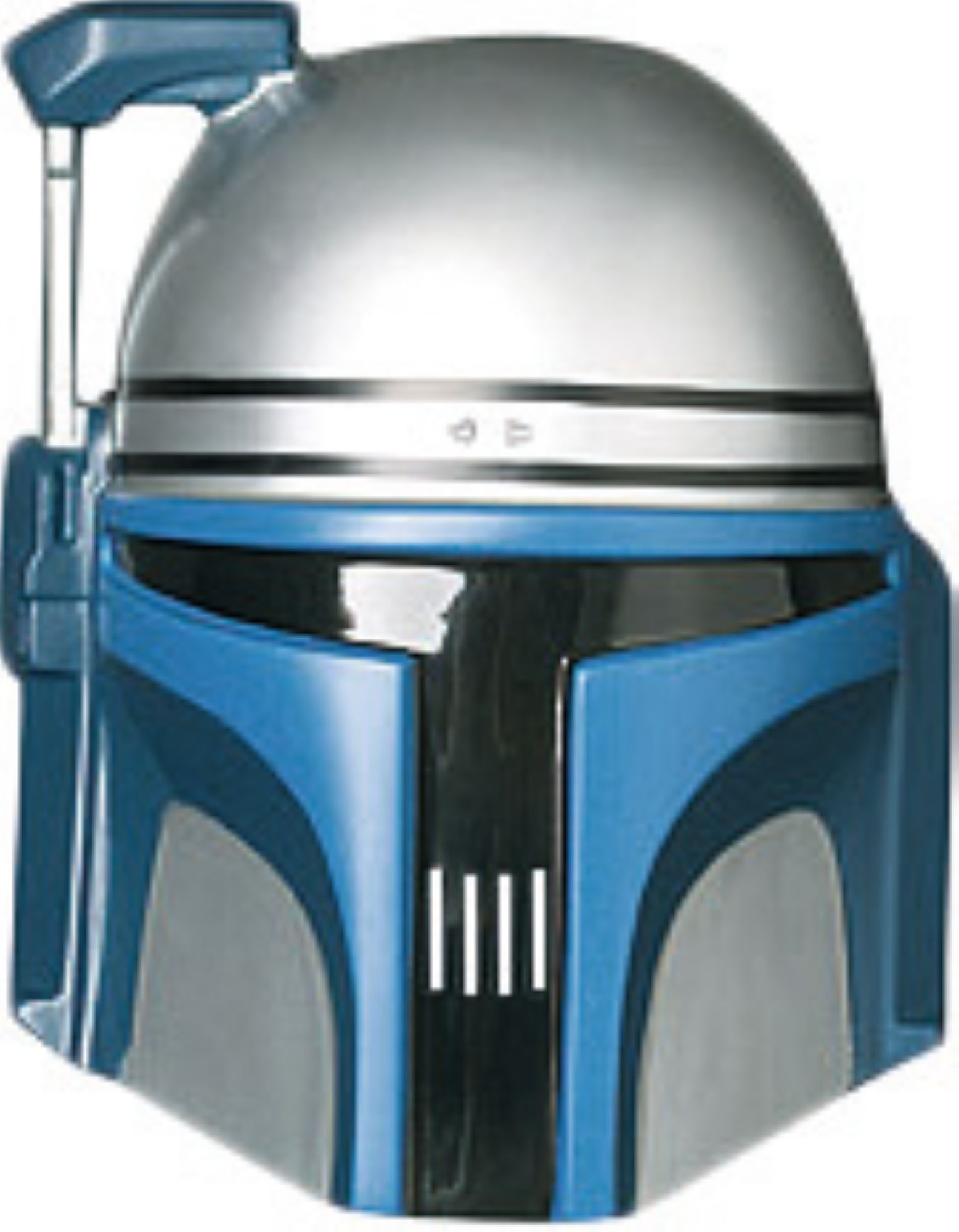Un masque en PVC de Jango Fett bleu et gris métallisé avec attache élastique à l’arrière.