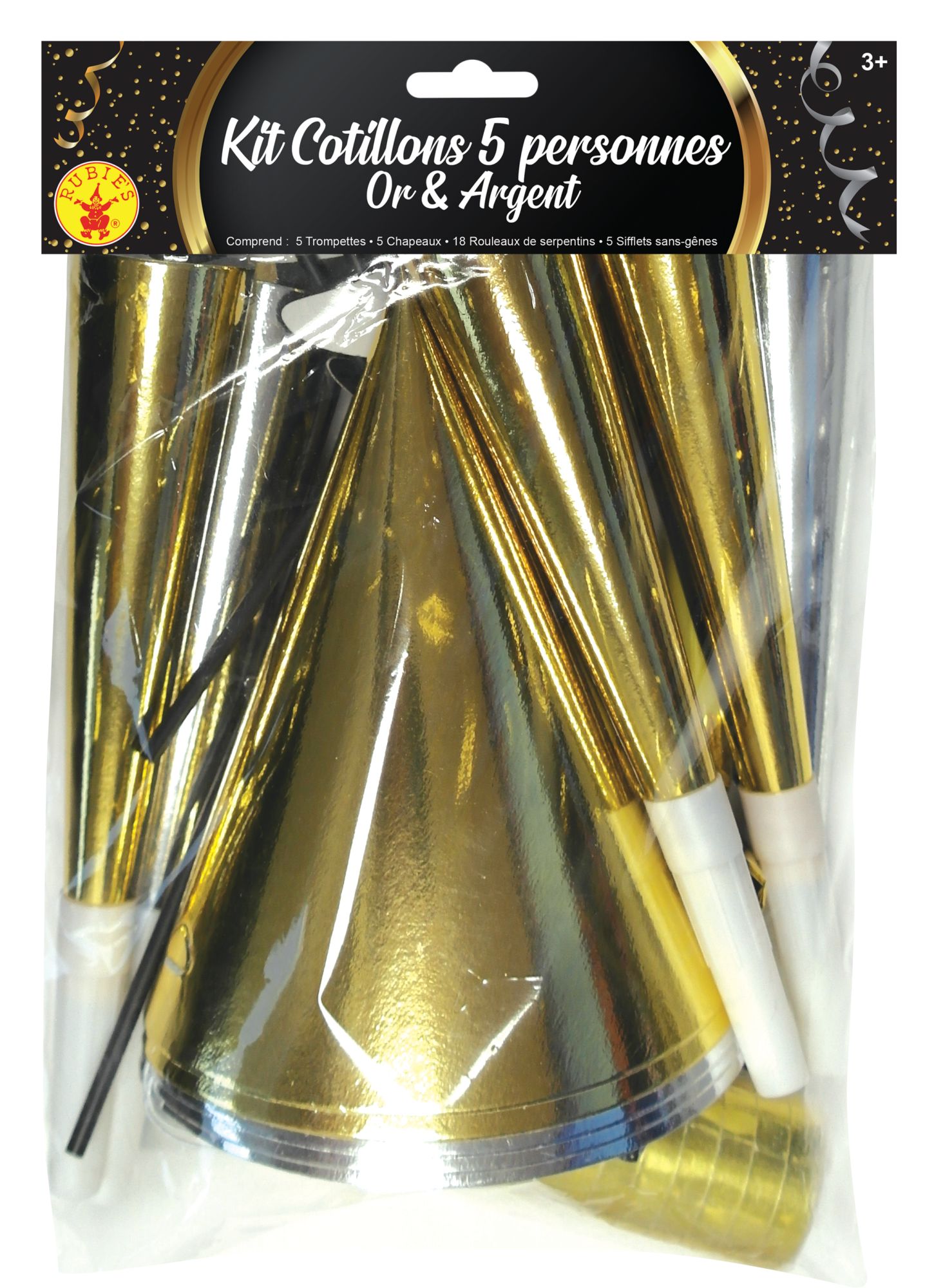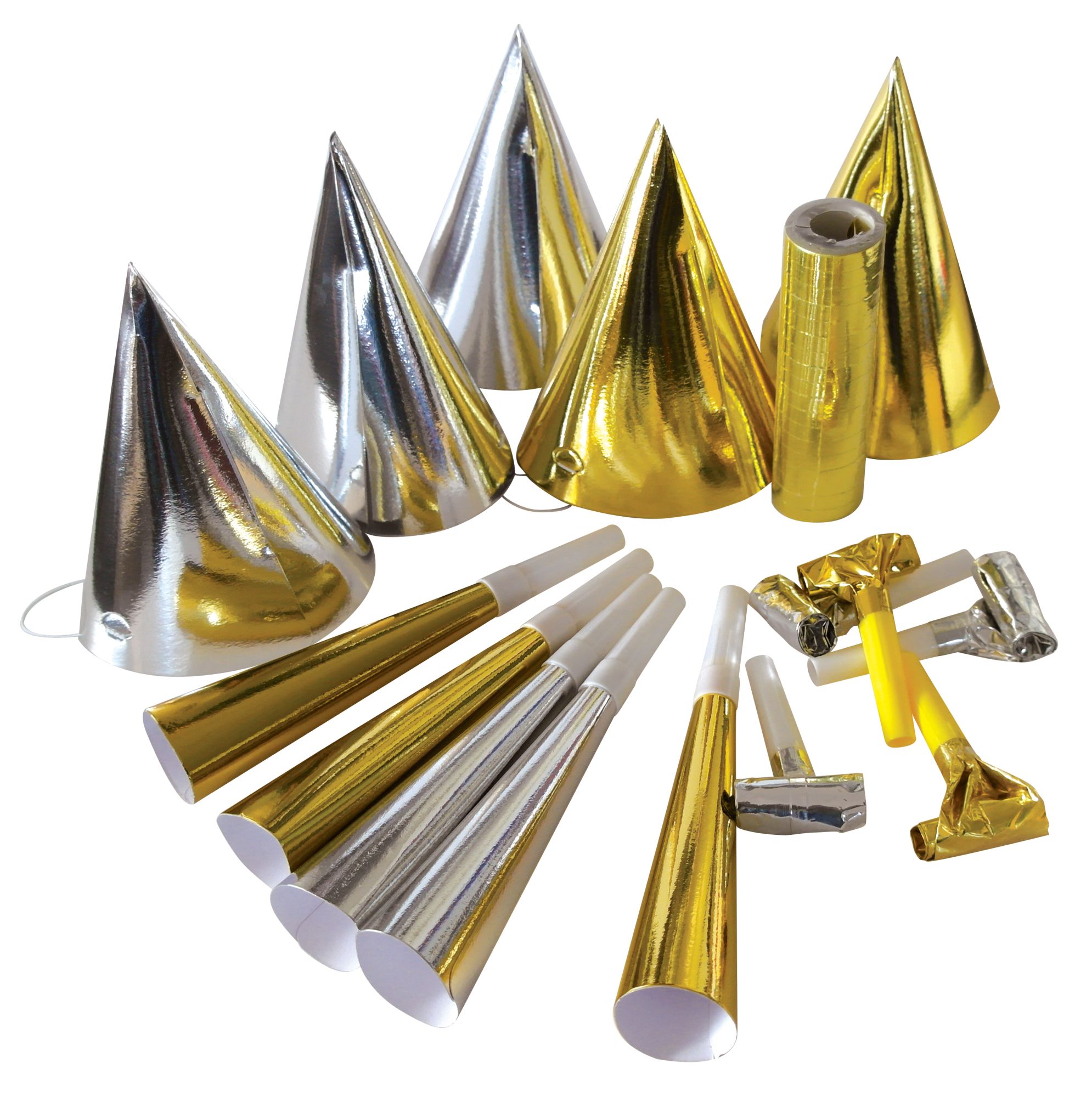 5 chapeaux pointus or et argent 5 sans gêne or et argent 5 trompettes or et argent 1 rouleaux de 20 serpentins or