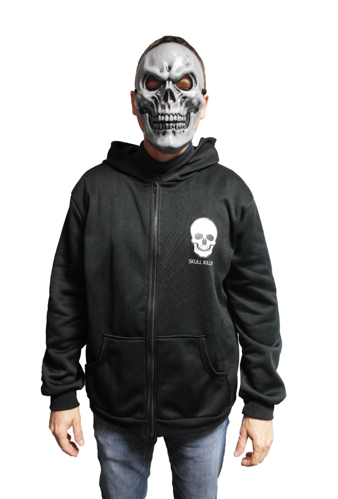 Style: S8858OHDescription: Un sweat à capuche avec fermeture éclair, imprimé d'une tête de squelette sur la poitrine. Comprend également un masque de squelette gris avec attache velcro. (arme non comprise)Packaging: Cintre cartonCatégories : Adulte, Déguisement, GENERIQUE HLW, Halloween, SqueletteThemes: Déguisement luxe, Halloween